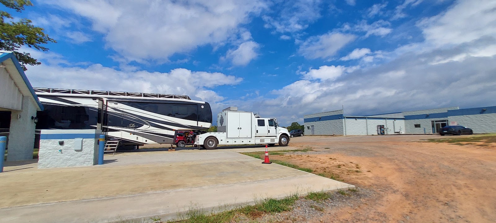 After another day of driving, we overnighted at Thor Elite Shooting Range, a Harvest Hosts location in Van Buren, Arkansas, which offers better accommodations than some RV parks.  It has capacity for 2 RVs, including a site for an extra-large set-up like ours.  We parked on a level concrete pad with access to a covered picnic area.  Water and electricity are available for $35/night, but we did not partake, relying instead on our solar/battery system.  However, Dad patronized the Hosts by purchasing a guest pass for $25 to gain access to the outdoor shooting range.  The grounds have a nice pond, for which you can pay a fee to fish, but Mom and I just used its perimeter as a walking track while Dad did his target practice.